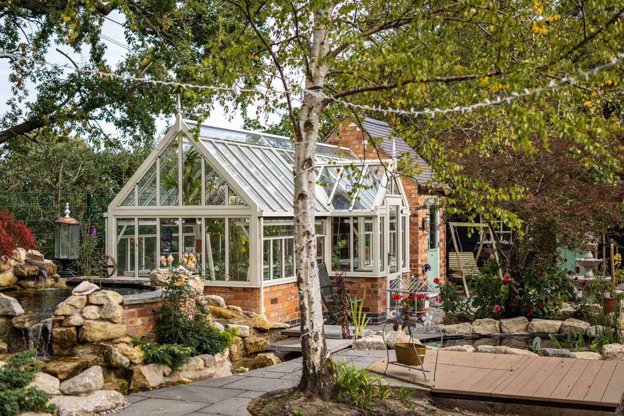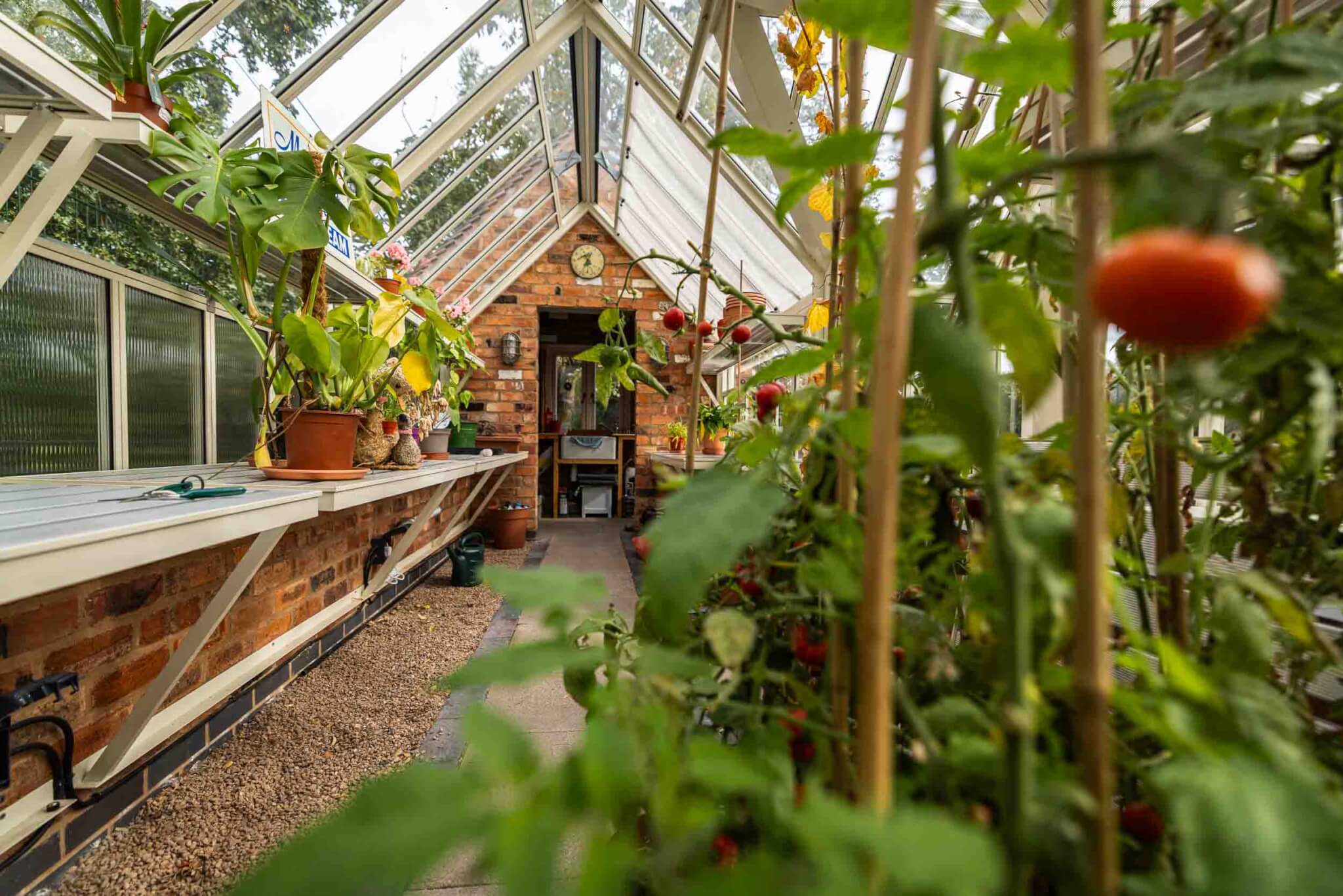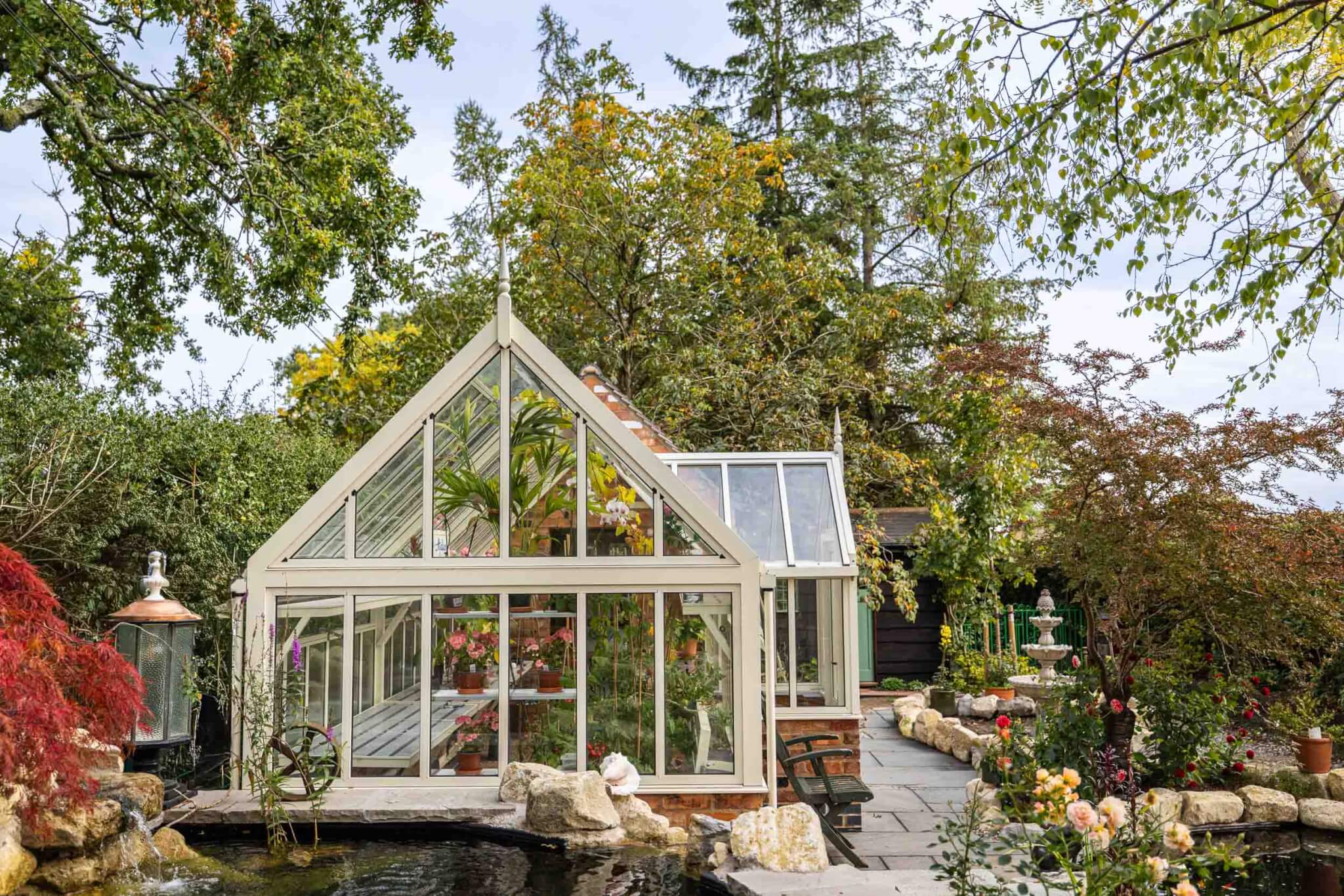 In this classic walled-garden setting, precision meets purpose. The greenhouse is a Victorian style with a central porch, finished in Oyster White powder coating. It sits neatly on a dwarf wall built to our specification, ensuring perfect alignment and proportion. At one end, the greenhouse abuts a brick-built potting shed, linked by an open doorway for easy transition between the two spaces, you don't want to be thinking about opening doors when your hands of full of freshly picked vegetables. Inside the potting shed, a Belfast sink provides the ideal spot for cleaning up after potting on, or scrubbing your root veg clean, a thoughtful touch that makes this a gardener’s workspace through and through. Within the greenhouse, staging and shelving align a central path to create an adaptable layout. The staging at one end has been folded down to allow extra height for vigorous tomato plants, while still leaving space for propagation and pot storage. Electricity has been fed into the greenhouse via a conduit in the base, discreetly powering tubular heaters beneath the staging to keep frost at bay as temperatures drop. Beyond the structure, the garden has been designed for calm and connection. Water features to the front and side of the greenhouse add a sense of tranquility. It’s a well organised and beautifully executed space : practical, elegant, and ready for year round use.